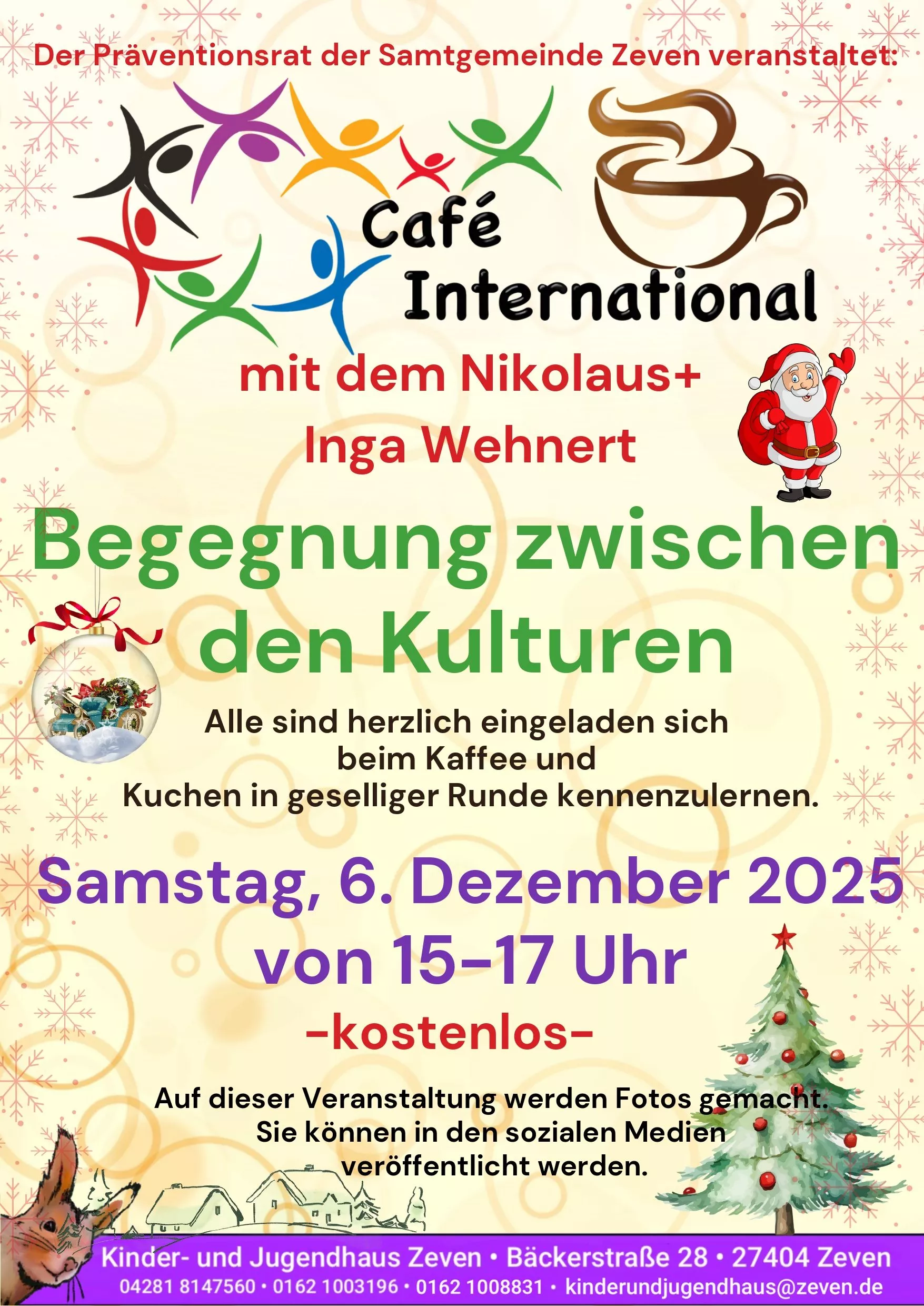 Der Präventionsrat der Stadt Zeven mit der AG Integration lädt alle neuheimischen und einheimischen Bürger*innen zum Café International am 6.12.2025 von 15.00 bis 17.00 Uhr in das Kinder- und Jugendhaus Zeven ein. Die ehrenamtlich Aktiven servieren ein Kuchen-Buffet und haben den Nikolaus eingeladen! Und die Sängerin Inga Wehnert wird mit den Gästen zum Besten geben, was die Kehlen hergeben 😉