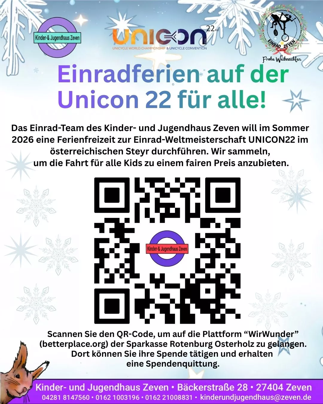 Das Team Einrad will im kommenden Jahr 2026 eine Ferienfreizeit zur UNICON22 der Einrad-Weltmeisterschaft ins österreichische Steyr machen. Um diese Ferienreise für alle Geldbeutel zu einem fairen Preis anzubieten, sammeln wir Spenden über die Fundraising-Plattform „WirWunder“ (betterplace.org) der Sparkasse Rotenburg/Osterholz bei Freunden und Freundinnen und Förderern des Einrad-Sports Freestyle in Zeven. Über den QR-Code können Sie/ könnt Ihr auf die Spendenplattform gelangen und sehr einfach einen Betrag zum Gelingen dieser Ferienfreizeit beitragen. Vielen Dank und eine friedliche Adventszeit.