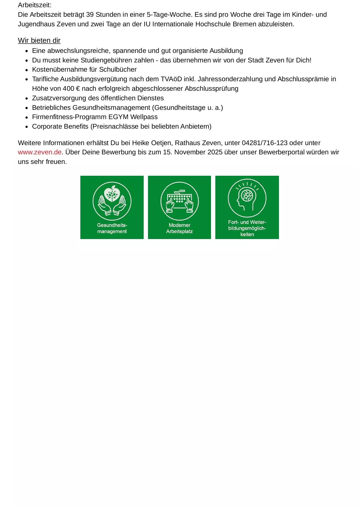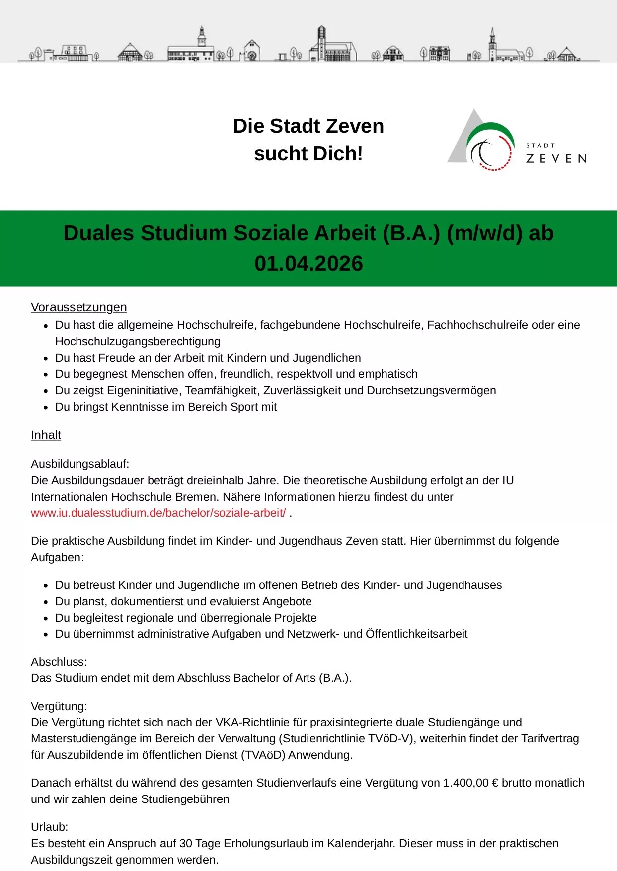 Die Stadt Zeven bietet einen Auszubildungsplatz für das duale Studium Soziale Arbeit ab 1.04.2025. Dieser Studiengang erfolgt in Kooperation mit der IU Internationale Hochschule Bremen. Die akademische Ausbildung wird an der Hochschule in Bremen stattfinden, und der praktische Teil bei uns im Kinder- und Jugendhaus. Ein attraktives Ausbildungsangebot für jemanden, der sich für eine humanistisch professionelle Arbeit mit Menschen berufen fühlt.