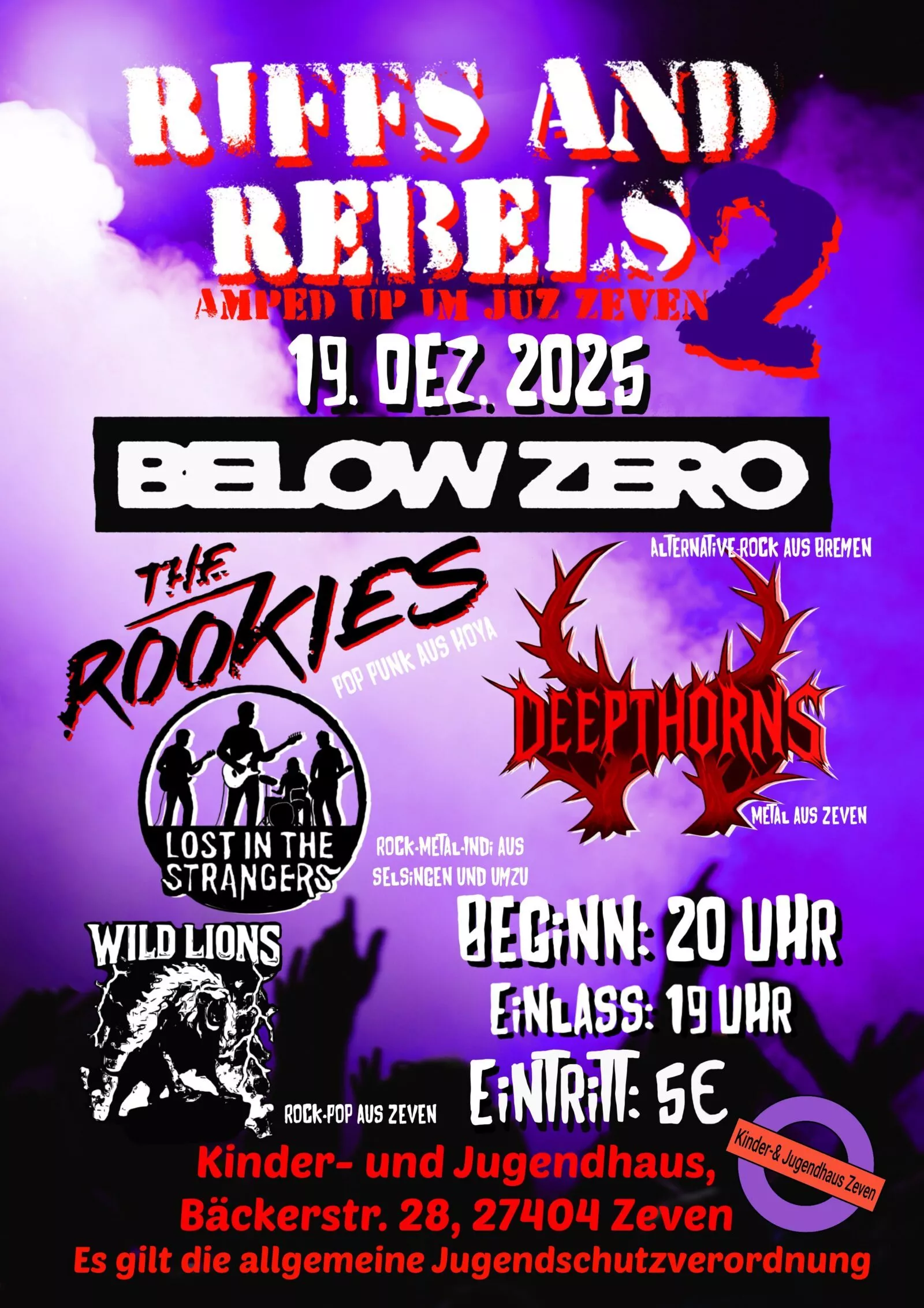 Das Jahresabschluss-Konzert-Ereignis im Jugendzentrum!!! Riffs’n’Rebells ging in die 2 Runde. Wir hatten zusammen mit den Nachwuchs-Artisten ein sehr cooles Line-Up zusammnestellen können. Es spielten auf: Wild Lions, Lost in the Strangers, Deepthorns, The Rookies, Below Zero!!!!!